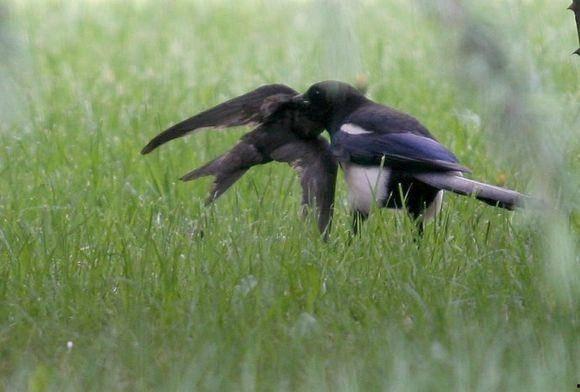 还有的时候,喜鹊会发现其他鸟类在吃瓜,它们会飞过去,试图分一杯羹。这种争夺食物的场景,让人看到了喜鹊之间的竞争与合作。